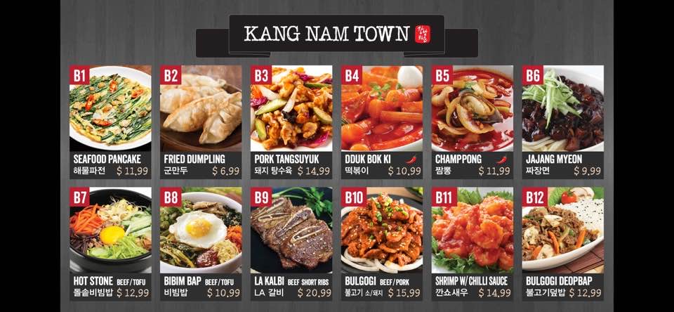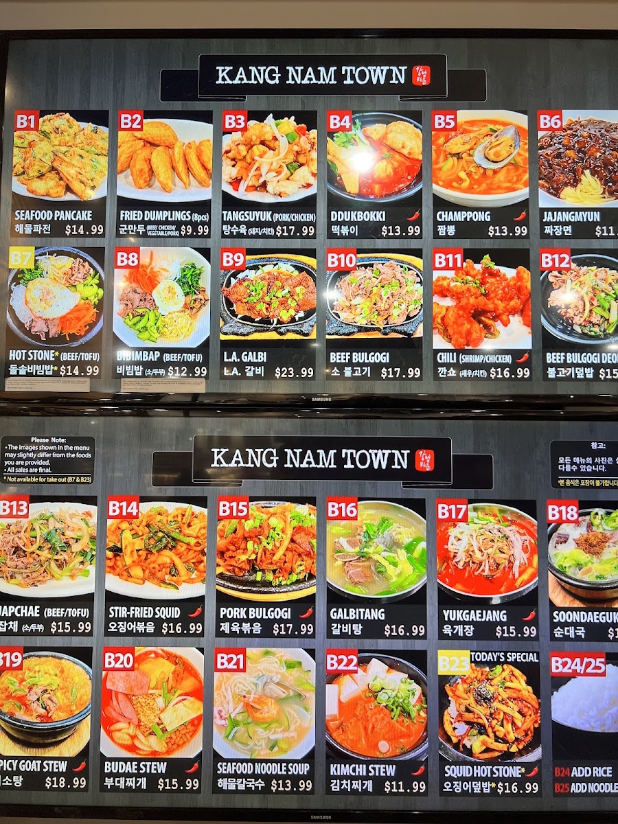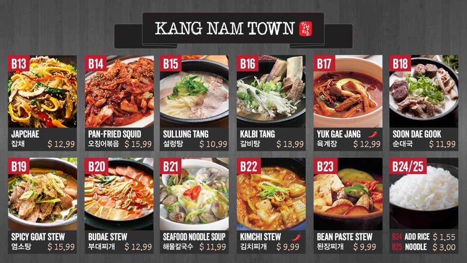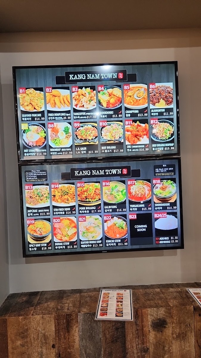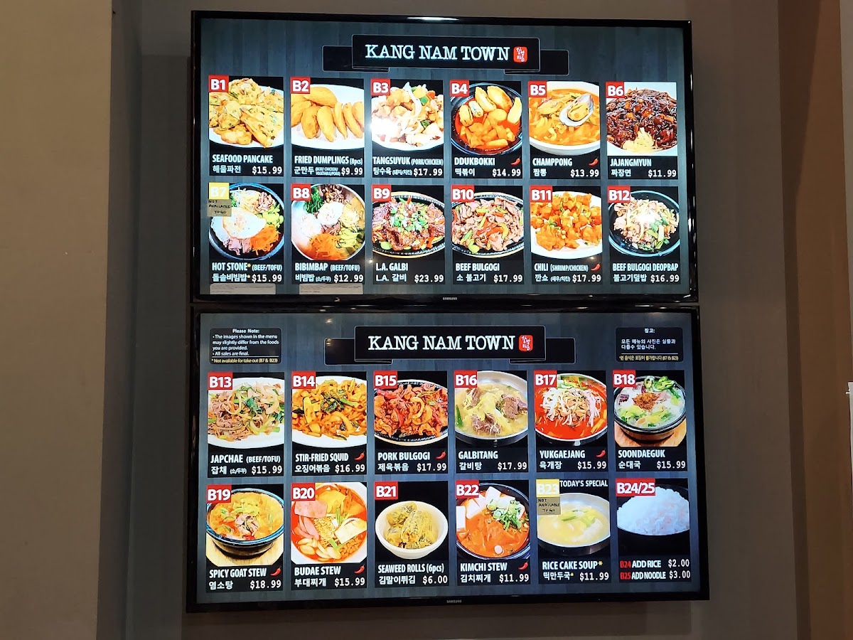 Kang Nam Town offers a selection of flavorful and comforting Korean dishes that cater to a variety of tastes. One standout option is the Kimchi Stew (B22), a hearty and spicy dish perfect for those who enjoy a tangy, fermented kick. For a more robust flavor, the Champong (B5), a spicy seafood noodle soup, is a must-try with its bold, savory broth. If you’re in the mood for something heartier, the Budae Stew (B20) combines a mix of meats and vegetables in a savory, spicy broth that’s sure to satisfy. For a more balanced, nutritious choice, the Bibimbap (B8) offers a delicious mix of rice, vegetables, and a fried egg, topped with spicy gochujang sauce. If you're craving something unique, the Spicy Goat Stew (B19) presents a flavorful, slightly gamey taste in a comforting broth, perfect for those seeking something different. Kang Nam Town’s menu provides a satisfying blend of traditional Korean comfort food at reasonable prices, making it a great choice for any occasion.